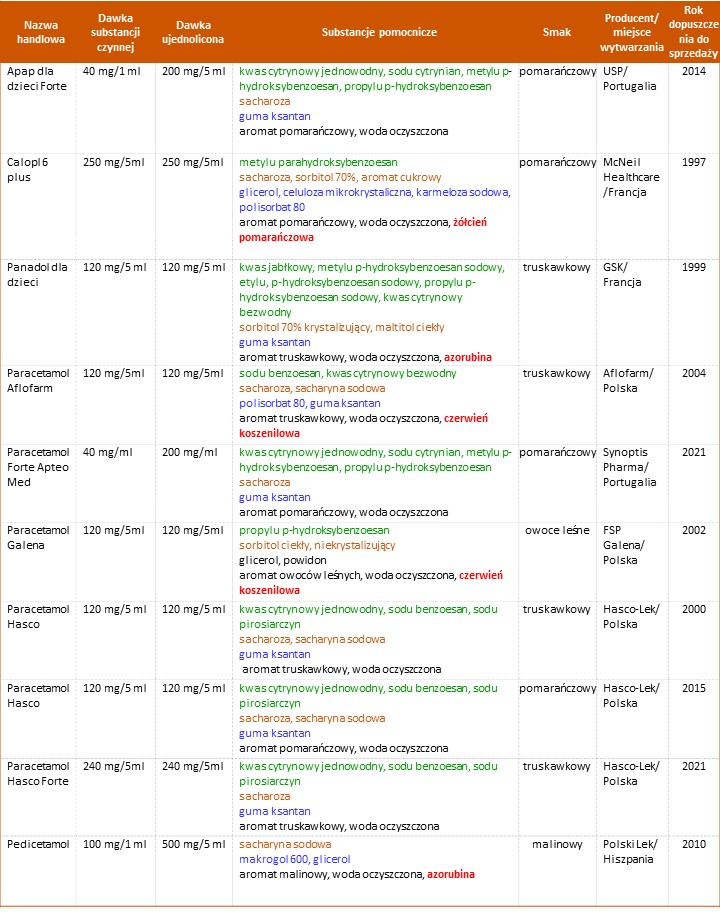 W aptekach znajdziemy zawiesiny zawierające paracetamol pod nazwami: Apap dla dzieci Forte, Calpol 6 plus, Panadol dla dzieci, Paracetamol Aflofarm, Paracetamol Forte Apteo Med, Paracetamol Galena, Paracetamol Hasco, Paracetamol Hasco Forte, Pedicetamol. Produkty te mogą występować w wersji „słabszej” lub „mocniejszej”. Nazywam je tak, bo w przypadku tych zawiesin nie ma „wspólnej nomenklatury”, której trzymaliby się wszyscy producenci.