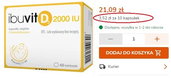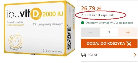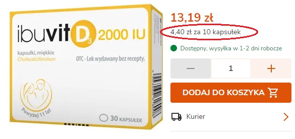 Za przykład wezmę znów witaminę D3. Wiemy, że należy ją suplementować od września/października do marca/kwietnia, czyli przez jakieś 6-8 miesięcy w roku. Na stronie jednej z aptek internetowych znalazłam markę, która ma 3 różne wielkości opakowań.