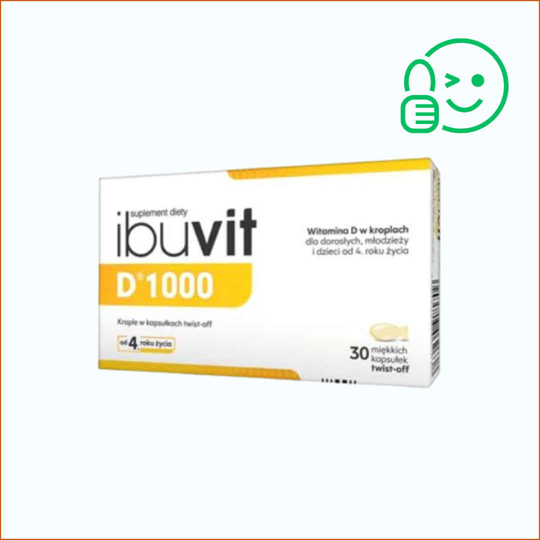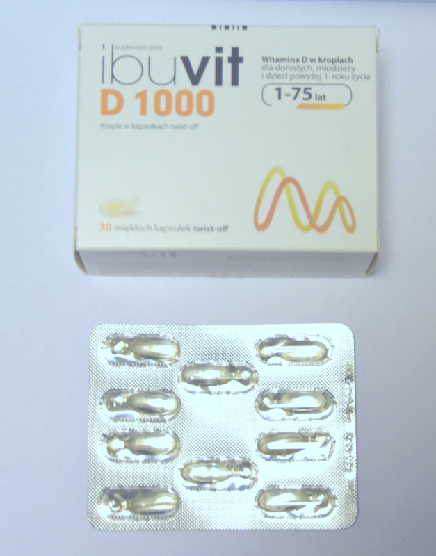 Suplement diety Ibuvit D 1000 j.m. to kapsułki typu twist off zawierające witaminę D3, która:
