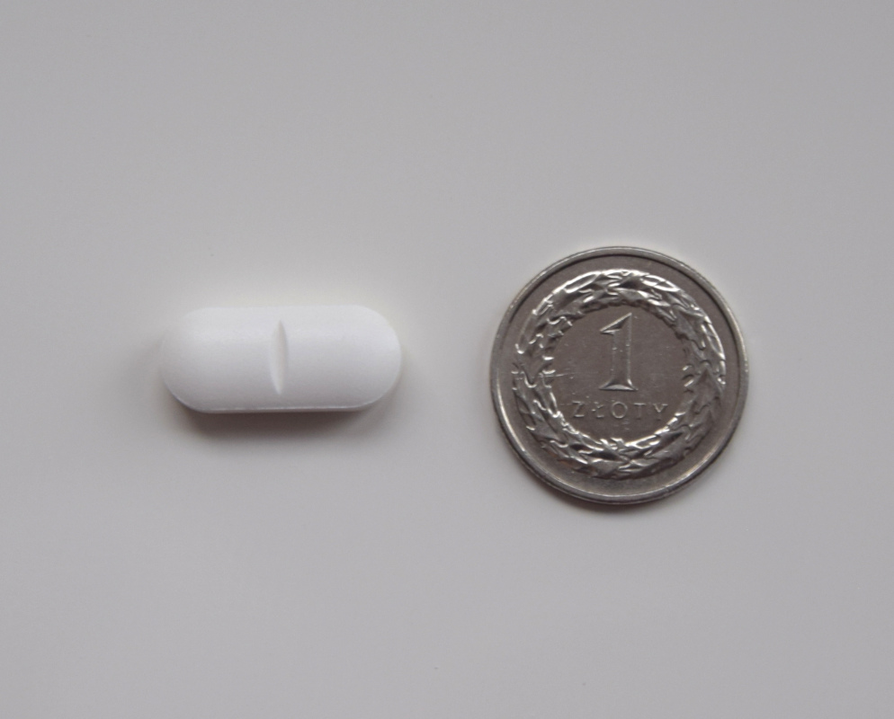 Polomag B6 Max to całkiem duże, podłużne białe tabletki z podziałką pośrodku. Mogą sprawiać problemy z połknięciem.